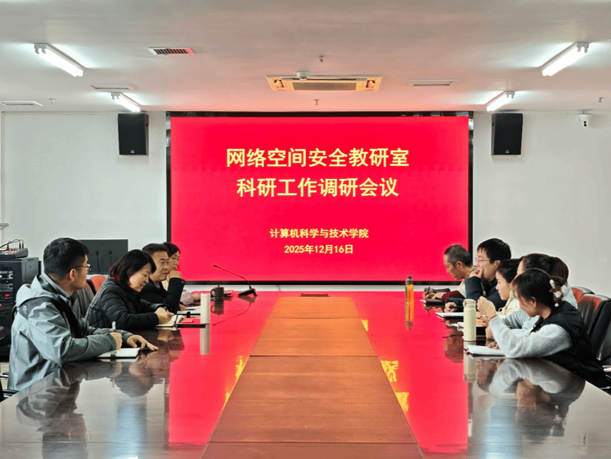 为深入了解科研进展,推动学院科研工作高质量发展,2025年12月16日下午,计算机科学与技术学院党委书记周启、副院长王建平,科研秘书赵晨萍、平台秘书范玉千、吕莹莹一行五人深入网络与空间安全教研室开展科研调研。
