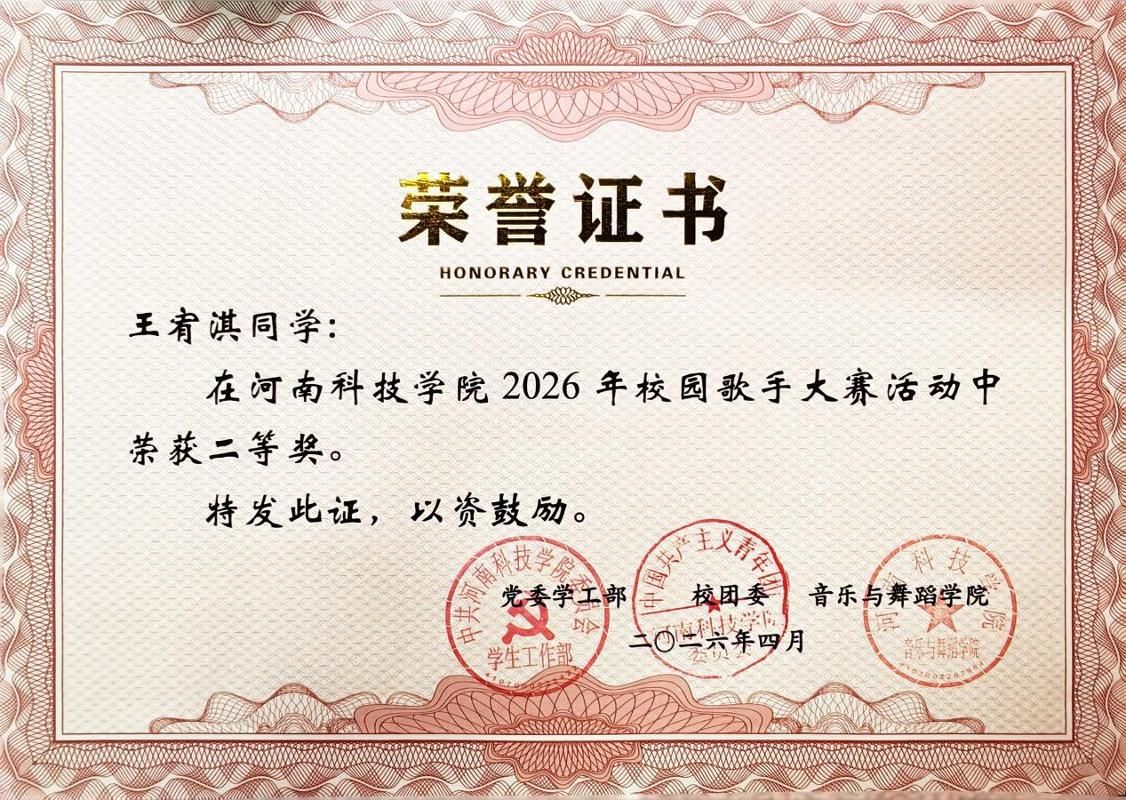 近日,由党委学工部、校团委主办,音乐与舞蹈学院承办的河南科技学院“唱响青春,声动中原”校园歌手大赛圆满落幕。我院学子在比赛中表现突出,数据251班刘妍琪荣获一等奖,计科253班王宥淇荣获二等奖。