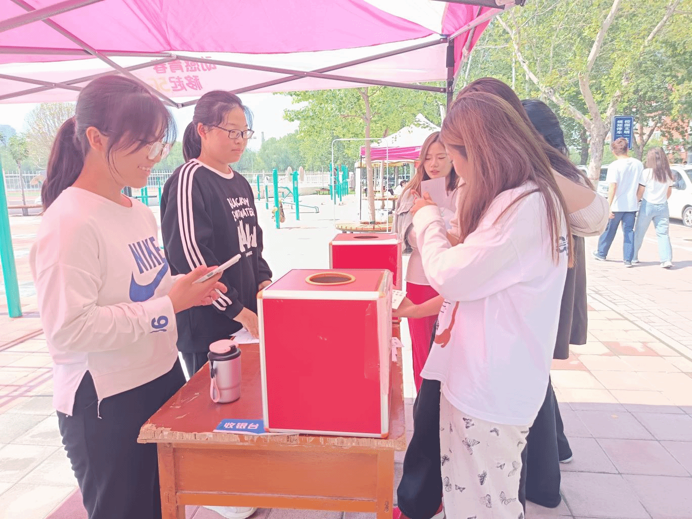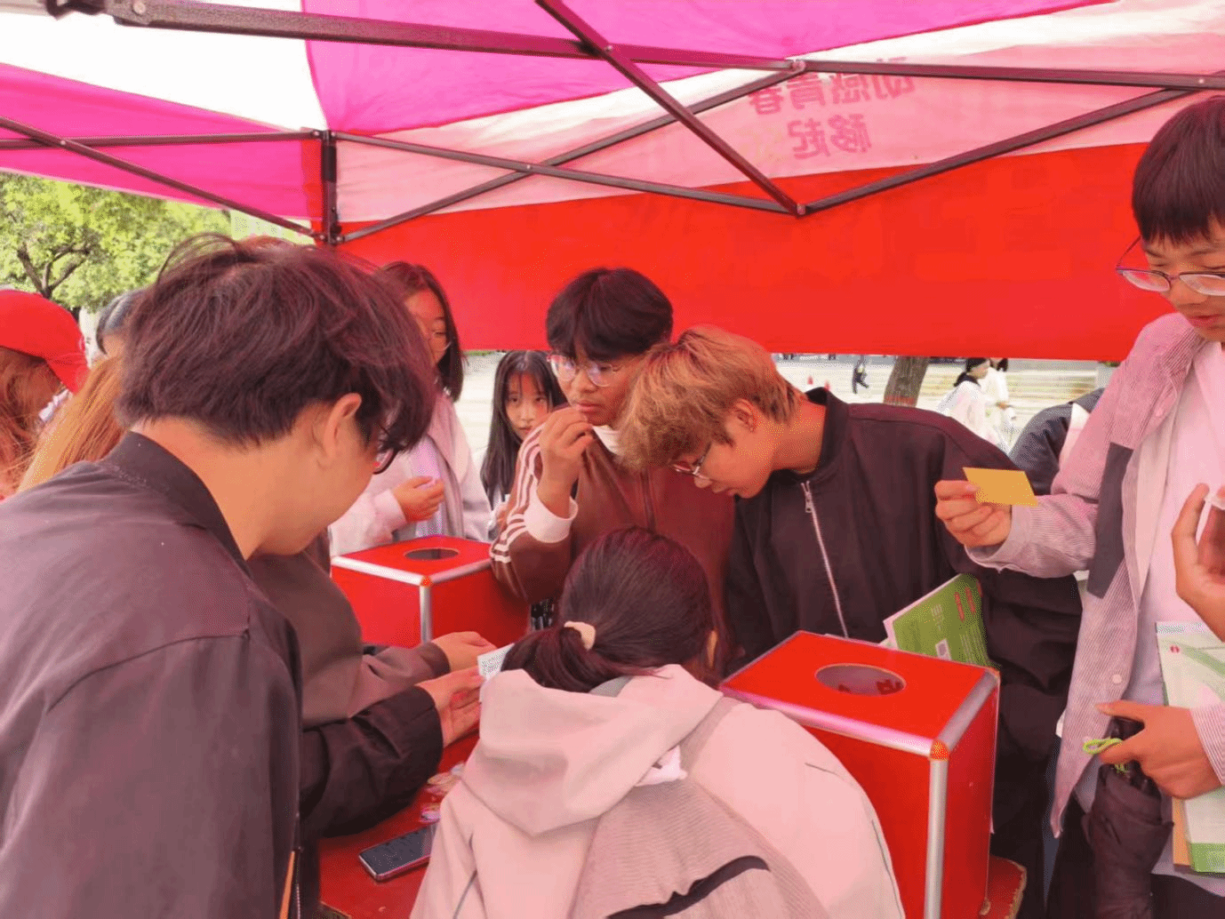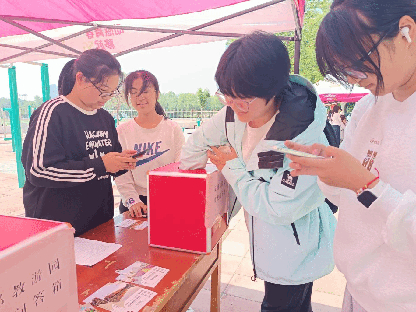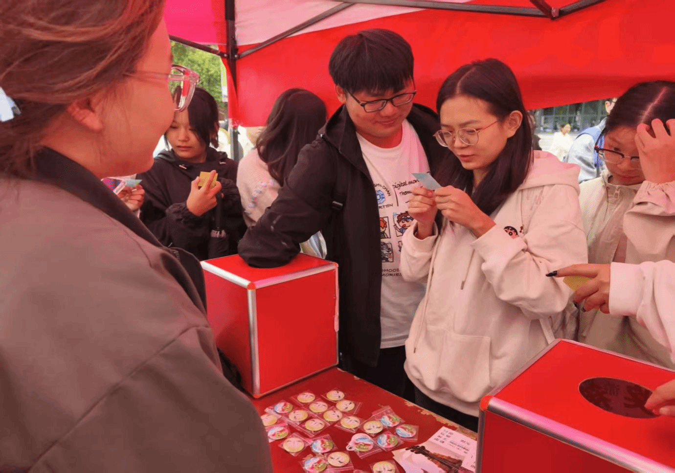 活动现场氛围热烈,师生们积极投身竞赛环节。本次竞赛采用“抽题作答”形式,参与者从抽奖箱中随机抽取反邪教知识题目,涵盖邪教危害、法律法规、辨别方法等核心内容。回答正确的师生获得定制徽章作为奖励,答错的参与者也收到了印有反邪教标语的明信片,在鼓励中加深知识记忆。